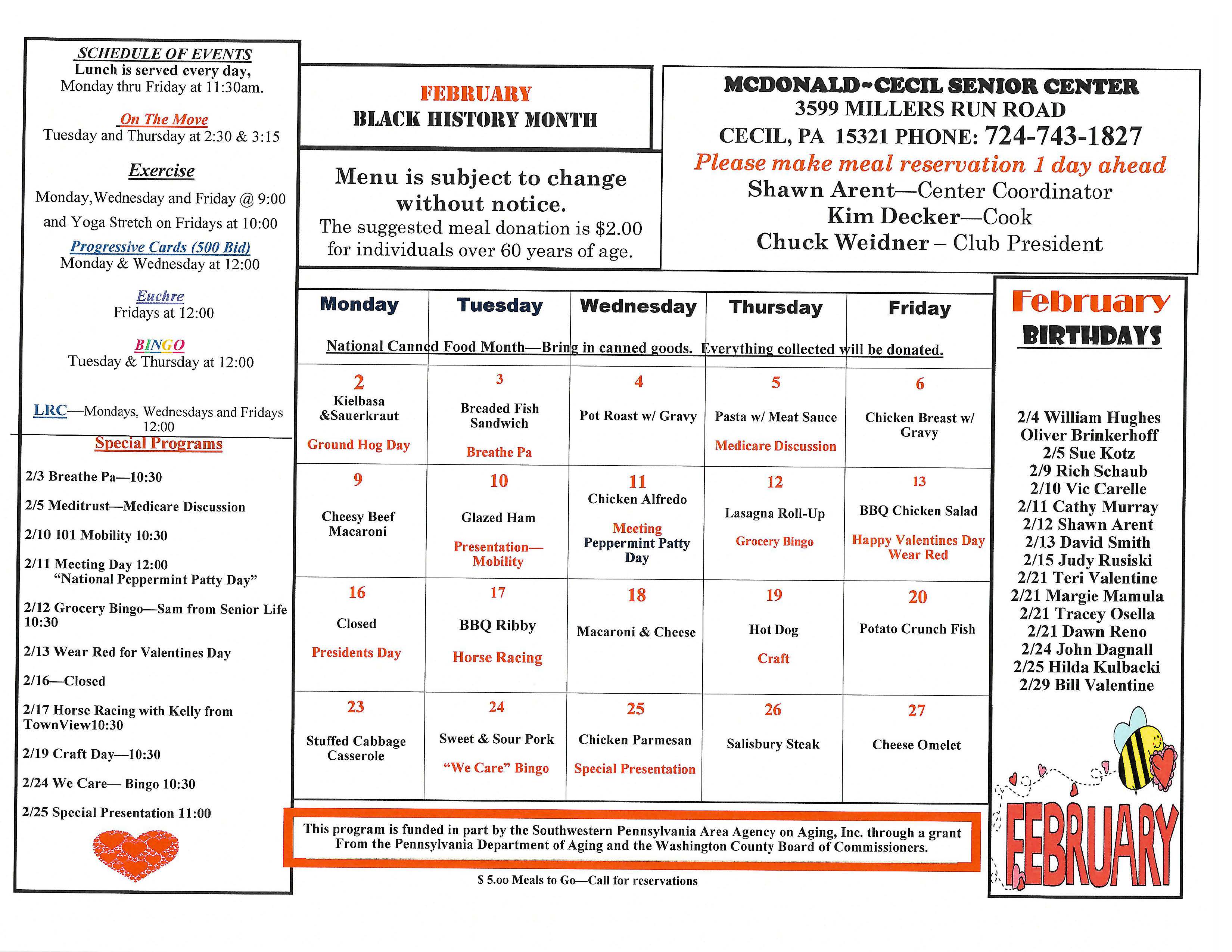 The Washington County Area of Aging helps to support the McDonald - Cecil Senior Citizens Center. The Center Coordinator is Shawn Arent.