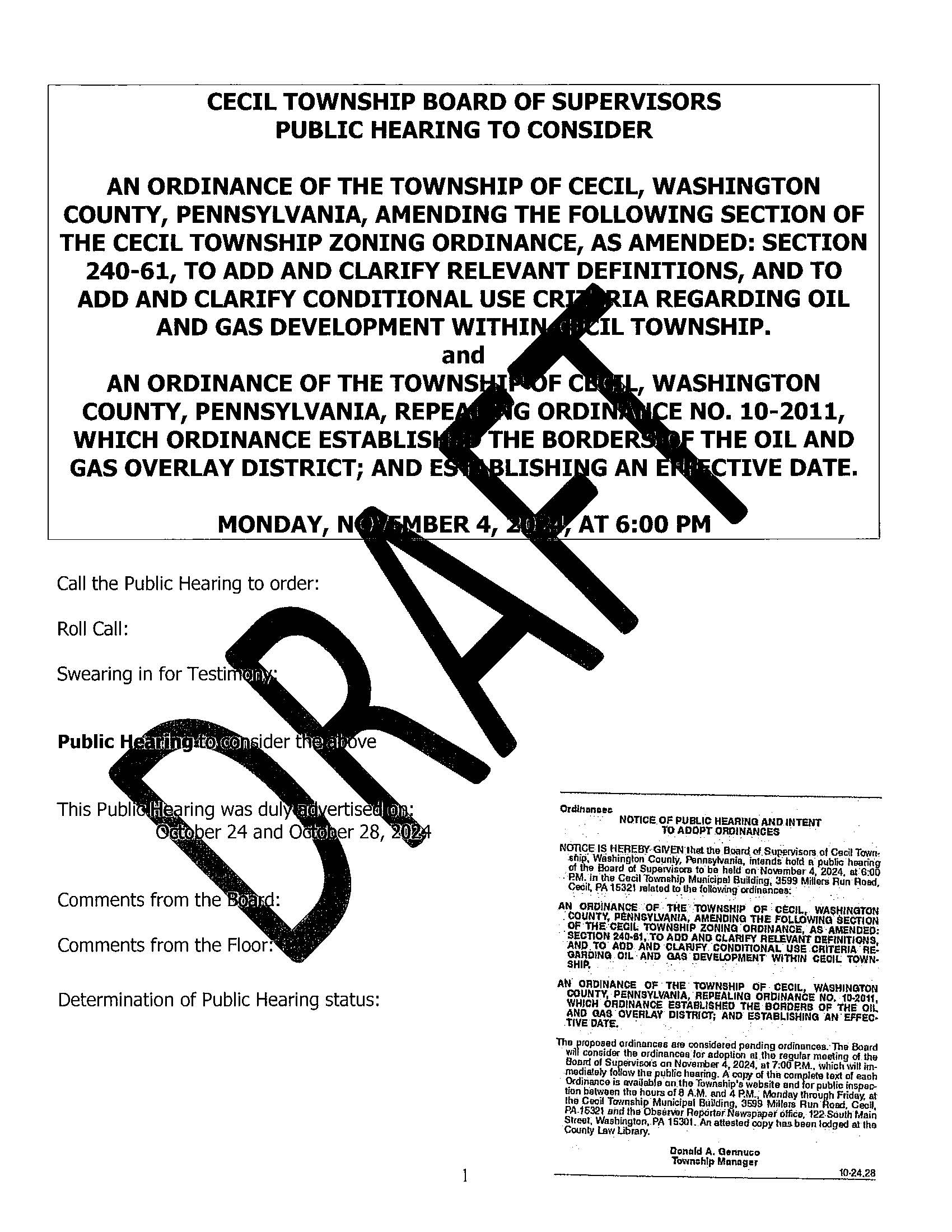 Nov 4, 2024Board of Supervisors Public Hearing - Ordinance 9-2024: Oil and Gas Ordinance |